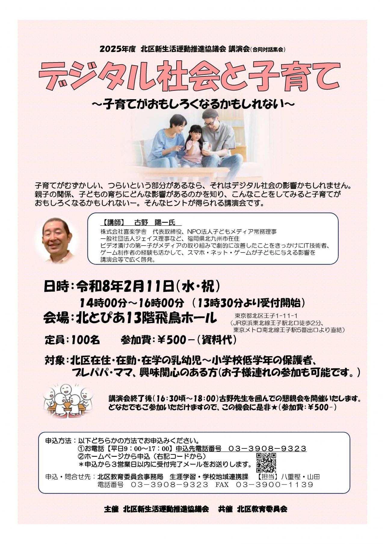 2月11日(水・祝)に北とぴあ13階飛鳥ホールにて、北区新生活運動推進協議会主催、北区教育委員会共催で行う「デジタル社会と子育て~子育てがおもしろくなるかもしれない~」を開催いたします。